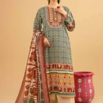 Radiate timeless grace in this exquisite beige three-piece suit, meticulously crafted for the winter season. The embroidered paneled shirt features a delicate round neckline with elegant embellishments, lace accents on the front, and intricate sleeve detailing. Paired with pintuck-detailed trousers and a soft khaddi dupatta, this ensemble offers a harmonious blend of traditional embroidery and modern sophistication, perfect for weddings, festive events, or special occasions.